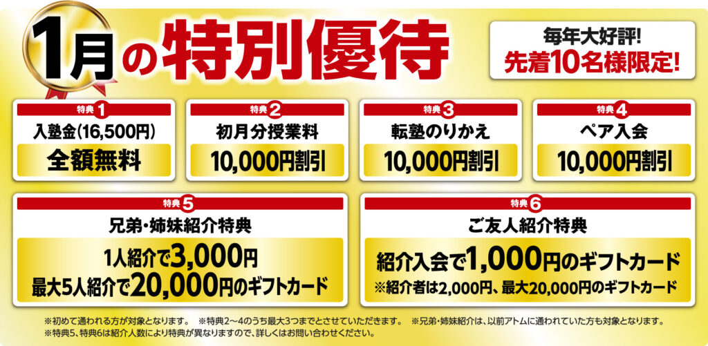 アトムでは厳選された内容をきめ細かく指導するのでテストの点数が上がります。アトムで保証している「1科目+20点以上点数アップ」は当たり前のことと思って下さい。成績が上がらなければ、1学期無料で授業が受けられる!