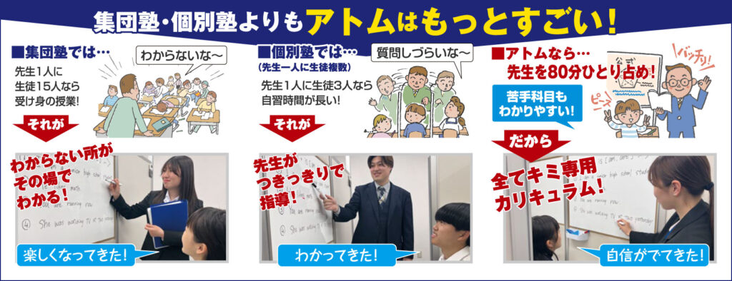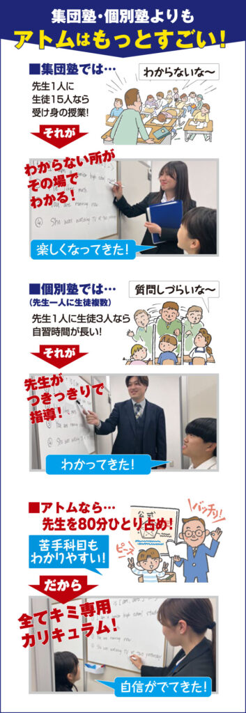 アトムでは厳選された内容をきめ細かく指導するのでテストの点数が上がります。アトムで保証している「1科目+20点以上点数アップ」は当たり前のことと思って下さい。成績が上がらなければ、1学期無料で授業が受けられる!