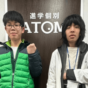 2年生の時から目指していた志望校の合格を目指しました。入ってすぐは結果が出なかったのですが、11月頃になると急激に偏差値があがり、元々目指していたよりも上のレベル高校に合格することができました。それは、アトムでの定期テスト対策や入試対策演習が充実していただけでなく、普段の授業でも先生が分からない問題をわかるまで教えてくれたからです。私の想像以上の結果を出させてくれた先生方に、本当に感謝しています。